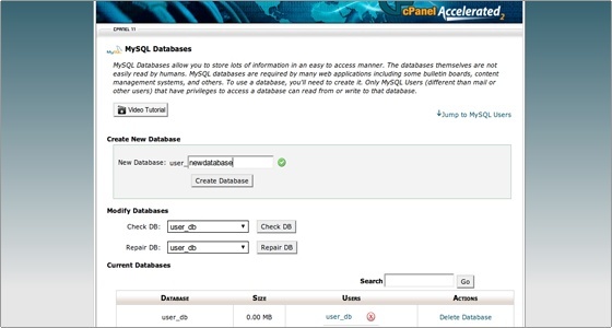 Karşımıza çıkan ekranda “Create New Database” başlığı altında bulunan “New Database” alanına oluşturmak istediğimiz veritabanının ismini giriyoruz ve “Create Database” düğmesini basıyoruz. Aşağıdaki resimde tarif ettiğimiz ekranı görmekteyiz.